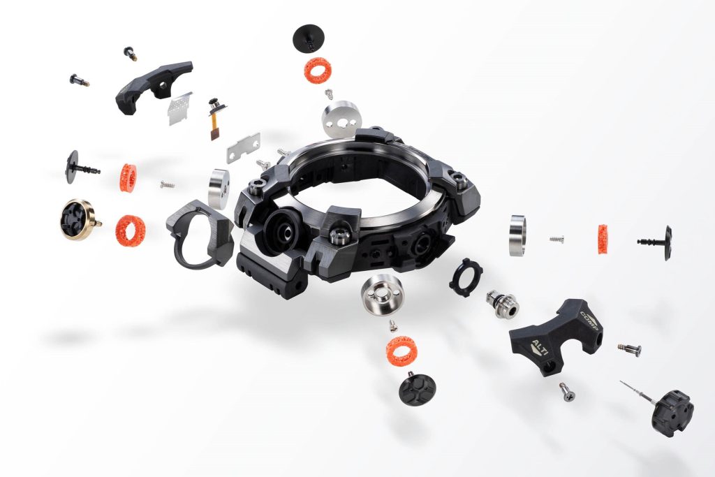 The protector parts at the 12 and 6 o’clock positions guard the watch glass, which is typically the most shock-susceptible. These parts are treated with a diamond-like carbon (DLC) coating to provide even greater abrasion resistance. These parts are cut out of components that are first forged into bezel shapes in a painstaking production process that renders complex shapes in metal. The complex molded form of the front button guard is achieved with a different method, metal injection molding (MIM).