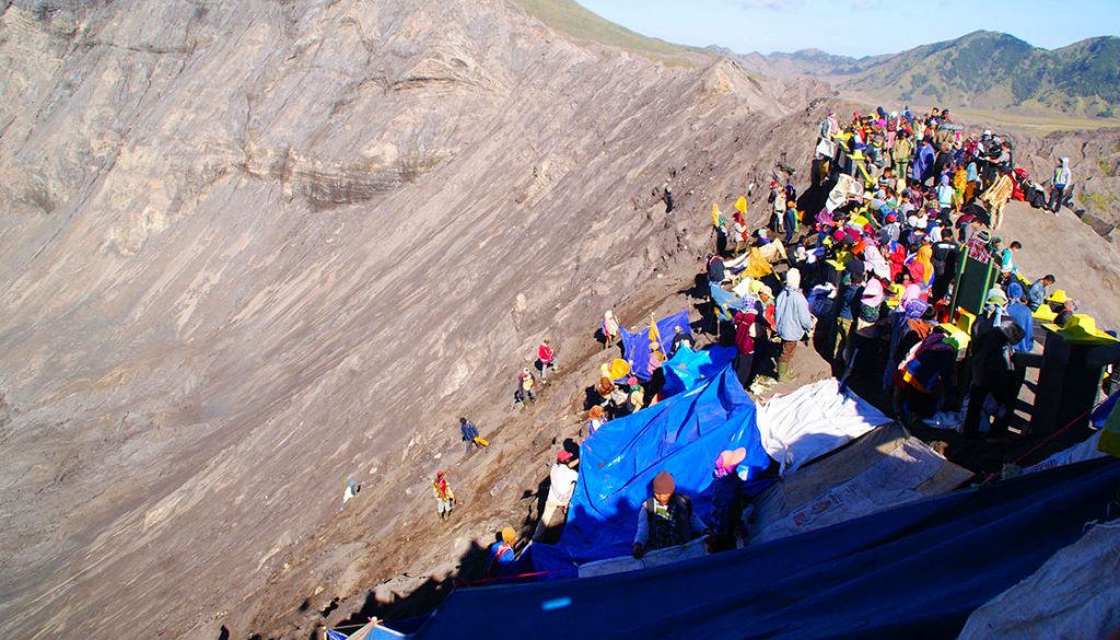 One of the biggest local events is The Yadnya Kasada festival, or commonly known as Kesodo. Each June, the Hindu Tenggerese people of Probolinggo East Java, Indonesia celebrate the month-long Yadnya Kasada festival. On the 14th day of the festival, the Tenggerese make their way to the ridges of Mount Bromo. There, the worshipers hurl their worldly possessions including crops and livestock like chicken, lamb, flowers, vegetable, and money into the mouth of the volcano, in an effort to free the community from disease and natural disasters.