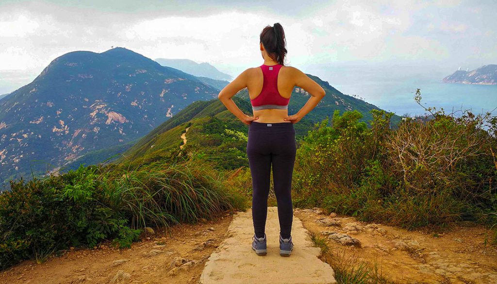 To get the most out of hiking, comfort is key, and the key to comfort is engaging the body with fitting garments. Finding a sports bra and pants that look good, fit well, and give you enough support for your workout is not easy. The good thing was, once we reached the top, we were immediately greeted with an unutterable view over Shek O Beach – and you know it got easier from here.