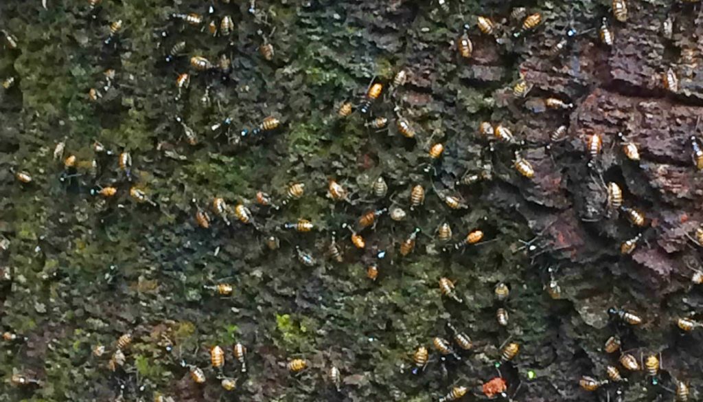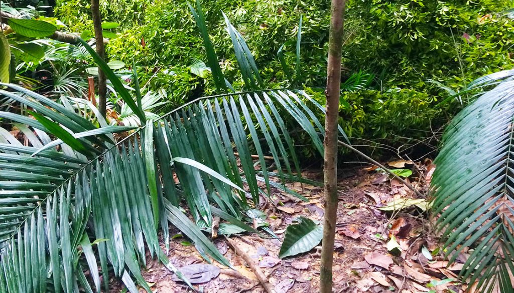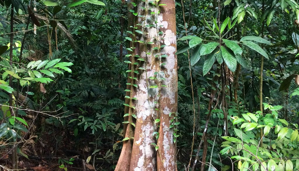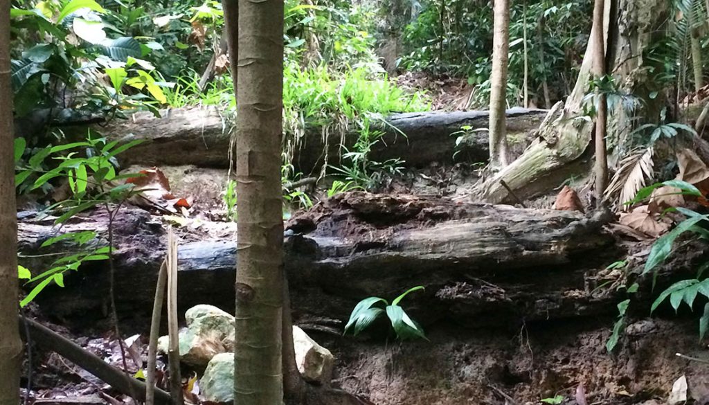 The trail was slightly damp in some parts and there was a gentle cool breeze that enveloped the forest. This hike was beginning to be very comforting as the air was fresh. We passed a tree and naughtily crawling upward on its trunk was a jungle creeper attempting to besiege the almighty tree. Along the route, there were once ‘great generals’ of the forest that had fallen to their deaths – since serving as an obstacle or aid along the forest trail – as we clambered over the dead trunks.