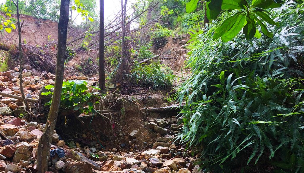 We started off and explored the outer entrance 100 metres before the forest, and found it uncertain. From where we stood atop the road, we did not see an opening trail. But getting “down” to the rocky patch from road level was dicey. This is where danger truly starts. If one tripped, it could go three ways. One, pick up yourself and dignity and carry on. Two, minor or severe bruising or lacerations. Three, severe injuries to the epidermis, dermis and/or subcutaneous tissue or tears, fractures or broken bones. Clambering down the rock debris is not to be taken lightly. Neither is walking across the piles of rocks and stones. This is clearly a precarious obstacle.