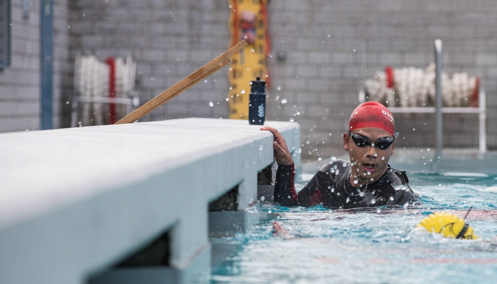 The first leg in the Deca Triathlon is swimming. Participants are given 25 hours to swim 780 laps in a 50-meter pool in 10 days.