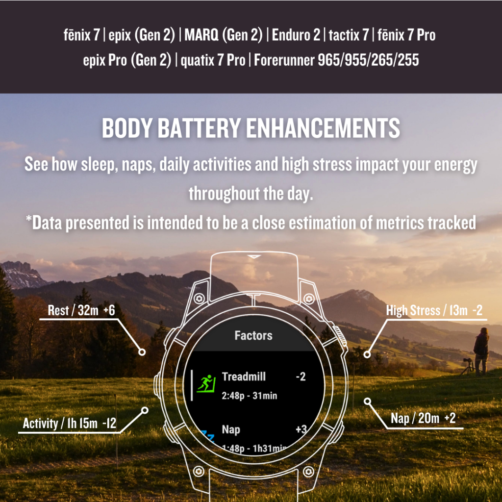 - Body Battery Energy Monitoring Enhancements: Get even more details and personal insights on how sleep, naps, daily activities and stress specifically impact energy levels – even get a daily summary every evening recapping energy use throughout the day.