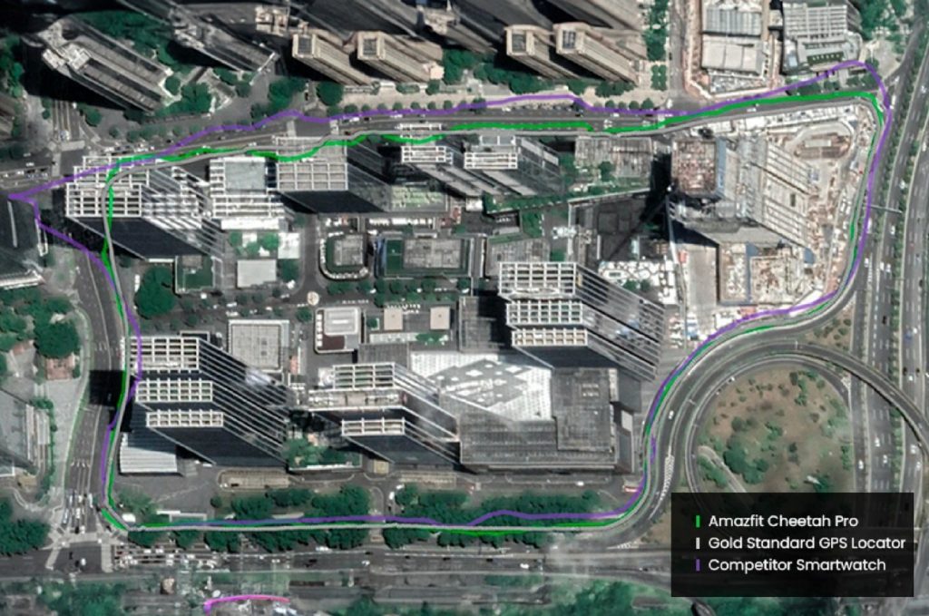 Recognizing the critical role of accurate GPS tracking for running watch users, Amazfit has revolutionized its proprietary dual-band circularly-polarized GPS antenna for the Amazfit Cheetah series. Internal testing has shown that this advanced antenna, now named MaxTrack™, achieves positioning accuracy that is 99.5% as precise as a professional gold standard GPS locator. The MaxTrack™ technology sets itself apart by capturing nearly 100% of satellite signals, surpassing conventional smartwatches with regular antennas that can only detect 50% of signals. By mitigating multi-path interference caused by environmental factors like tall buildings, trees, or cloudy skies, the Amazfit Cheetah series ensures unrivaled GPS tracking accuracy. Whether running amidst skyscrapers downtown or exploring nature trails, users can rely on the series to provide precise tracking.