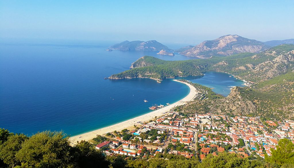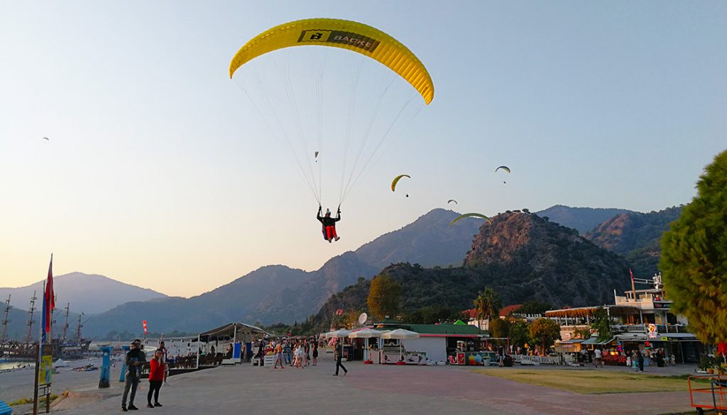After a long day hike, take a swim or simply relax your feet in a café at Oludeniz Belcekiz Beach. The sandy blue lagoon is filled with tourists and it is the landing place for paragliding.
